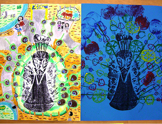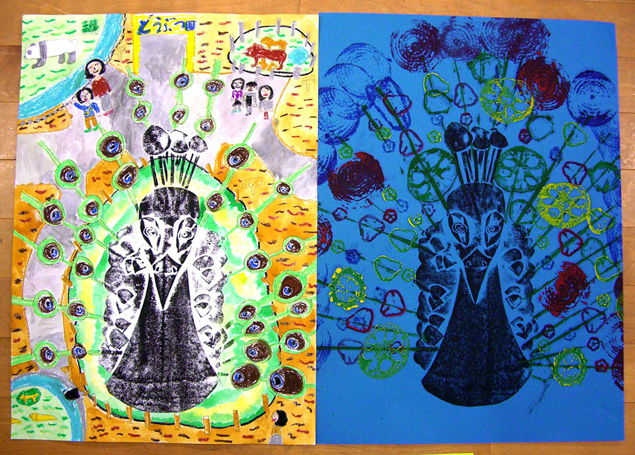 “版画_クジャク” クジャクを野菜スタンプと 白黒紙版画で現してみたね。野菜スタンプで造ったゴージャスな羽の模様も動物園にいる様子を描きこんだのも、同じ版を刷っているけれど、まったく様子が変わっておもしろいね。