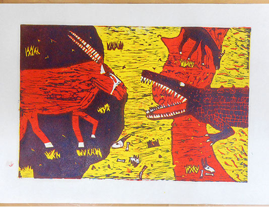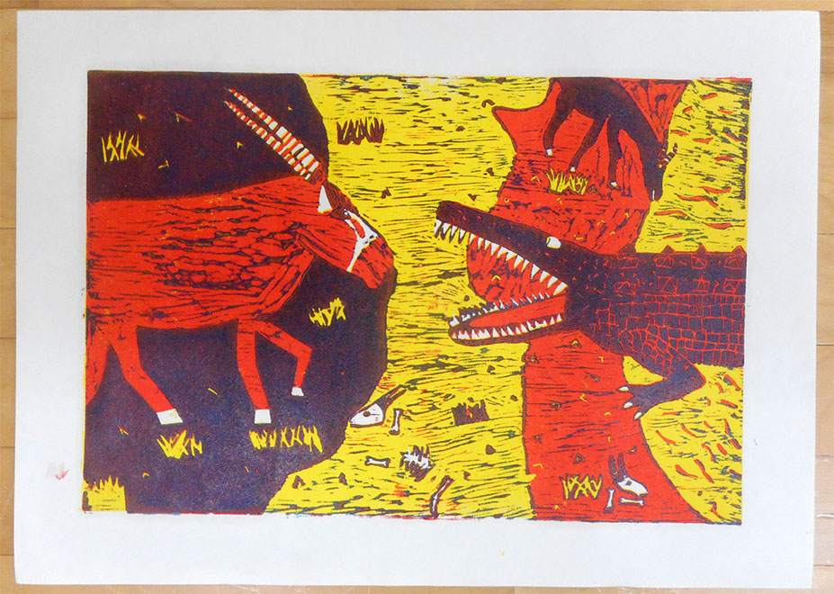 “版画_彫り進み木版” 赤、黄、青の3色を3版を使って現しました。組み立てが難しかったけれど、刷り上がってみると独特な雰囲気があって力強く魅力的です。