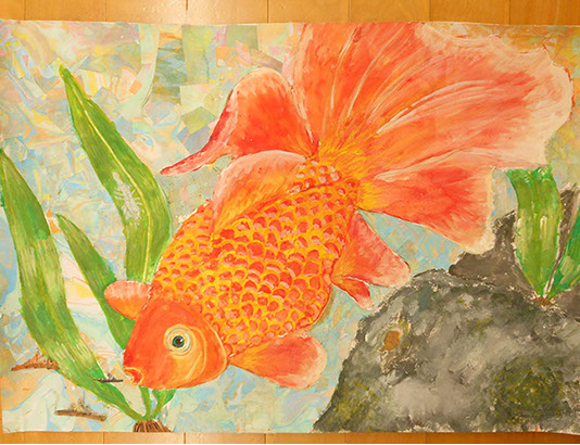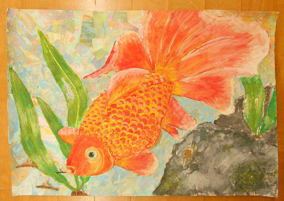 ”マーブリングの不思議な世界” マーブリング模様を水の波紋に生かし、金魚と組み合わせ描きこみました。大変美しい世界だね。