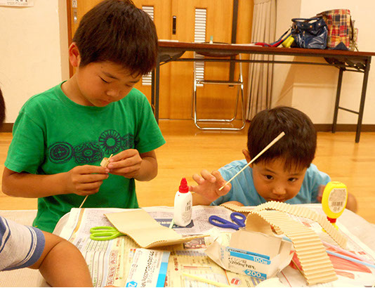 いろいろな形の木片を組み合わせ、なにを造ろうかな??