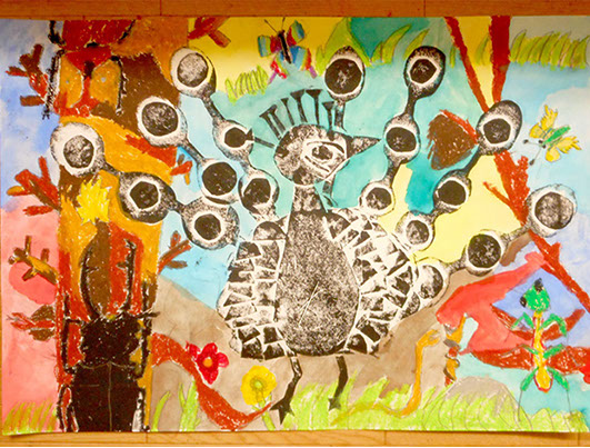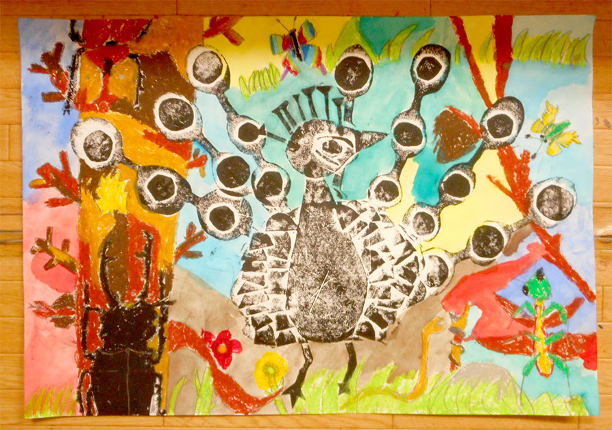 「はんが_くじゃく」 大きく羽を広げたりっぱなクジャクを版で現しました。森の中にいる様子が明確で力強い作品です。