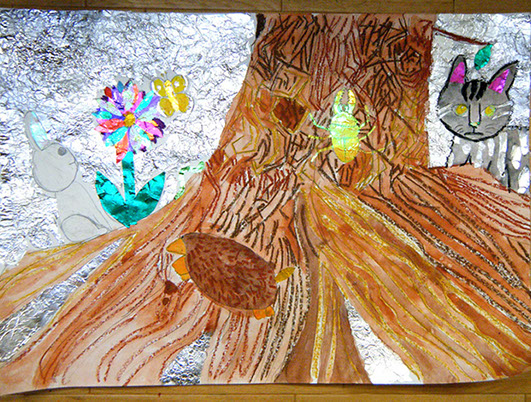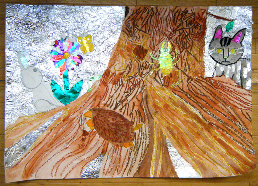 「キラキラの世界」 大きな木の根っこをクローズアップし描いていておもしろいね。キラキラホイルと合わせって、なんともいえない不思議な世界が広がります。