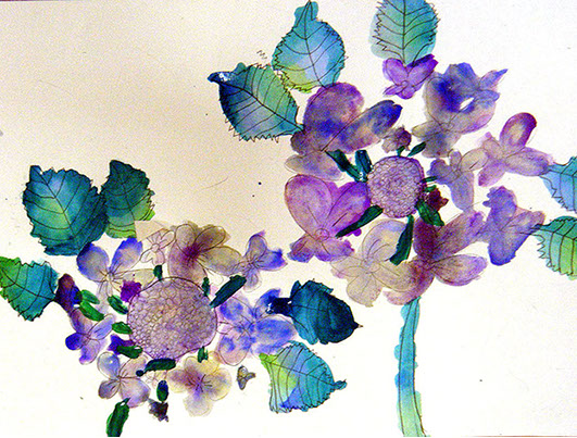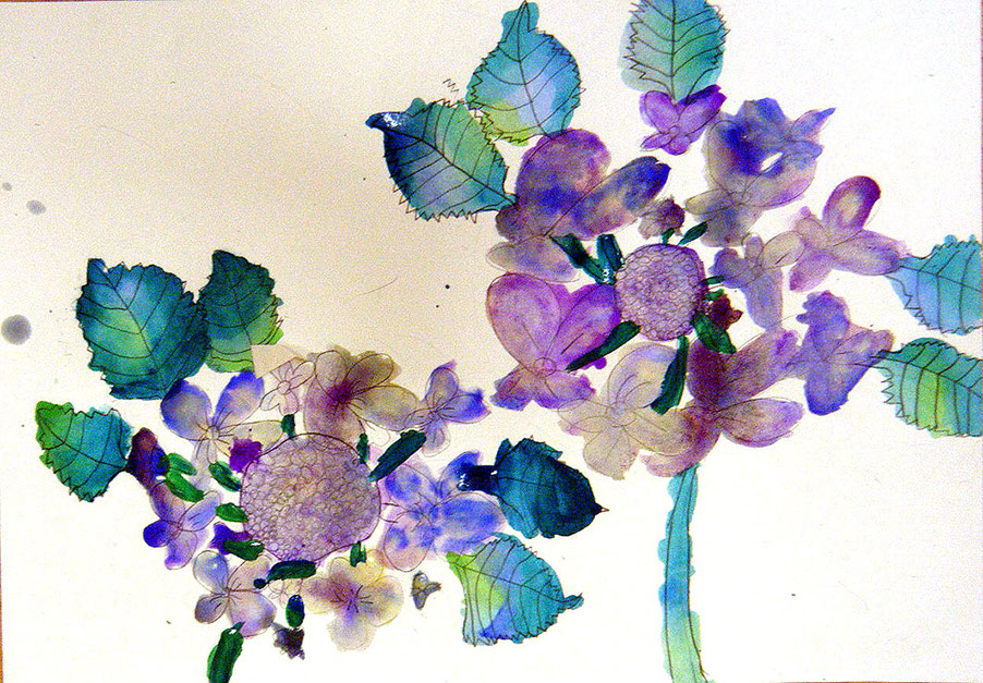 「写実_あじさい」 あじさいの細かな花の集まりを根気よく描きました。色の変化にも敏感に大変美しいあじさいです。