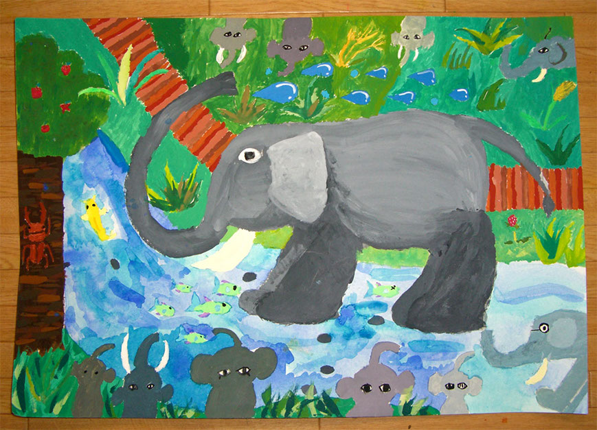 「じゆう画」 どんどんイメージを広げながら描いていきました。物語の一場面を見ているような大変ユニークな作品です。
