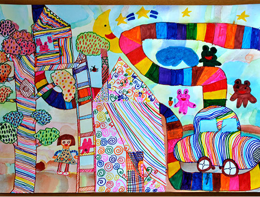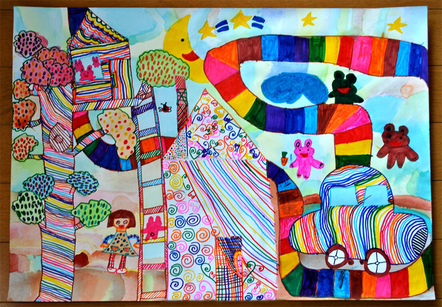 「線のおはなし」 いろいろな線で模様あそびをしながら描きました。とってもユニークな世界が広がっています。