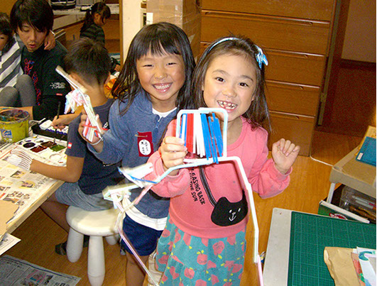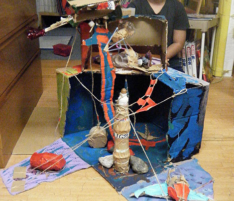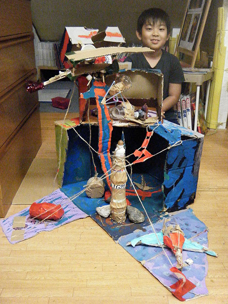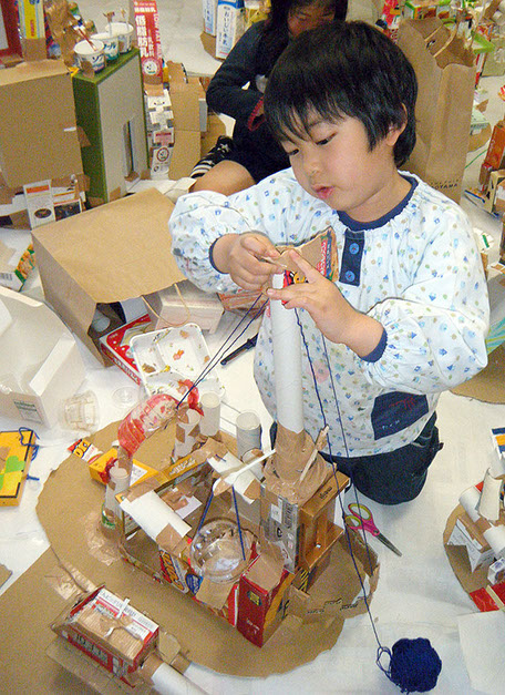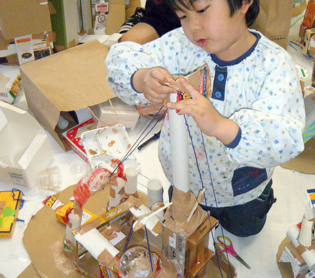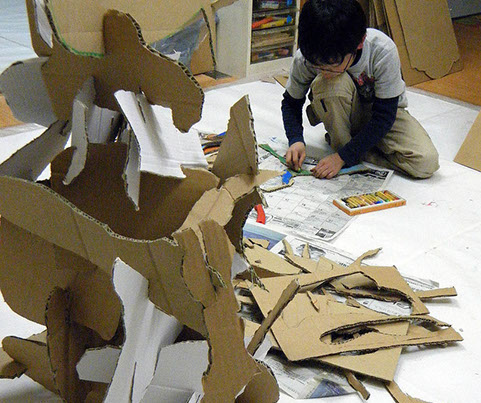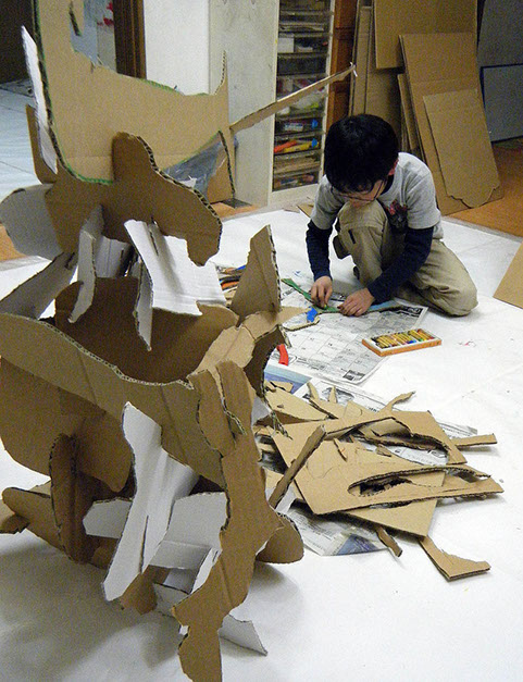 「ダンボールハウス」 どんどん発想を広げ、宇宙基地のようなダイナミックな建物の完成です。